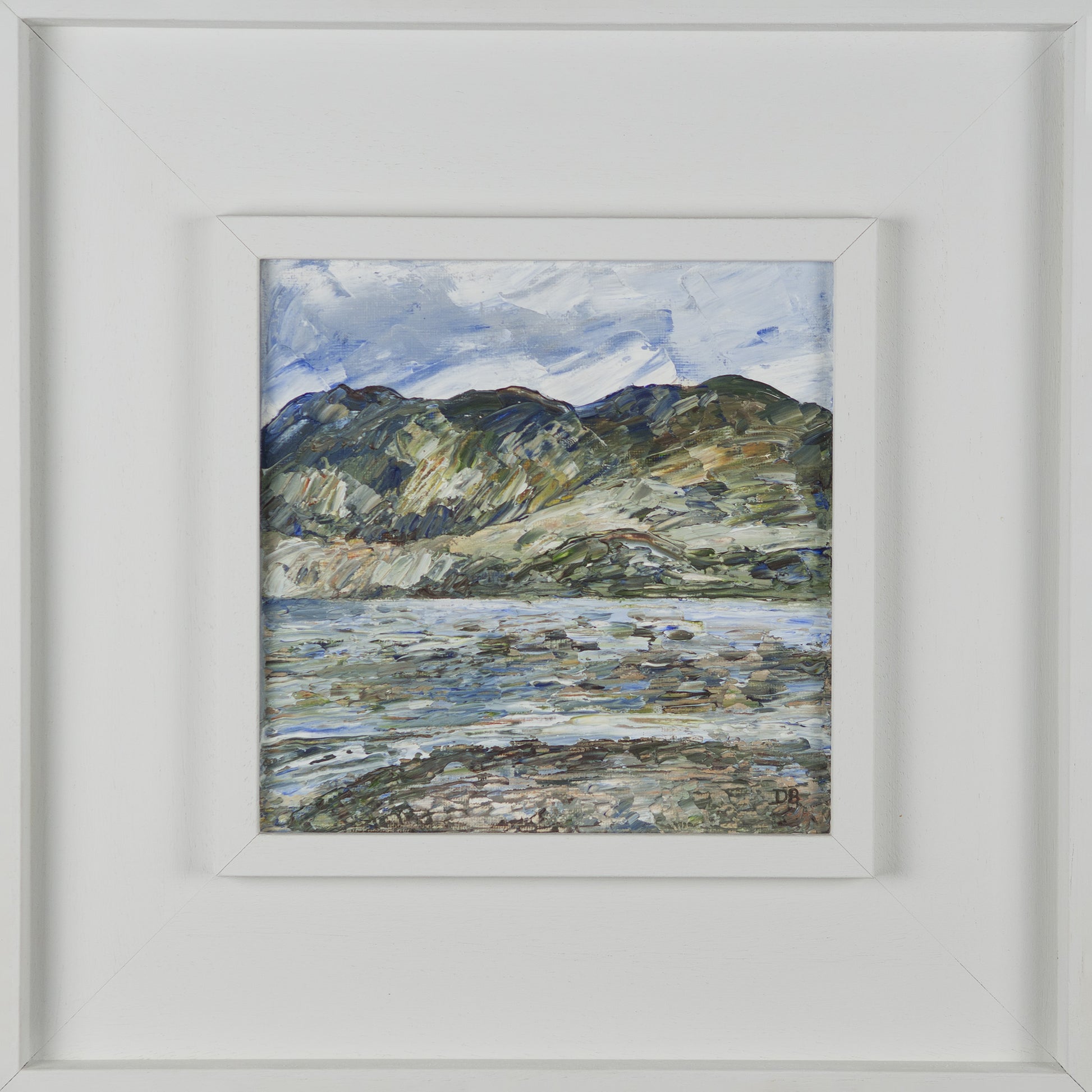 Landscape painting of Beinn Eighe Nature Reserve, Kinlochewe in Scotland, oil on canvas. Painted white St Ives frame. Frame size 36cm x 36cm