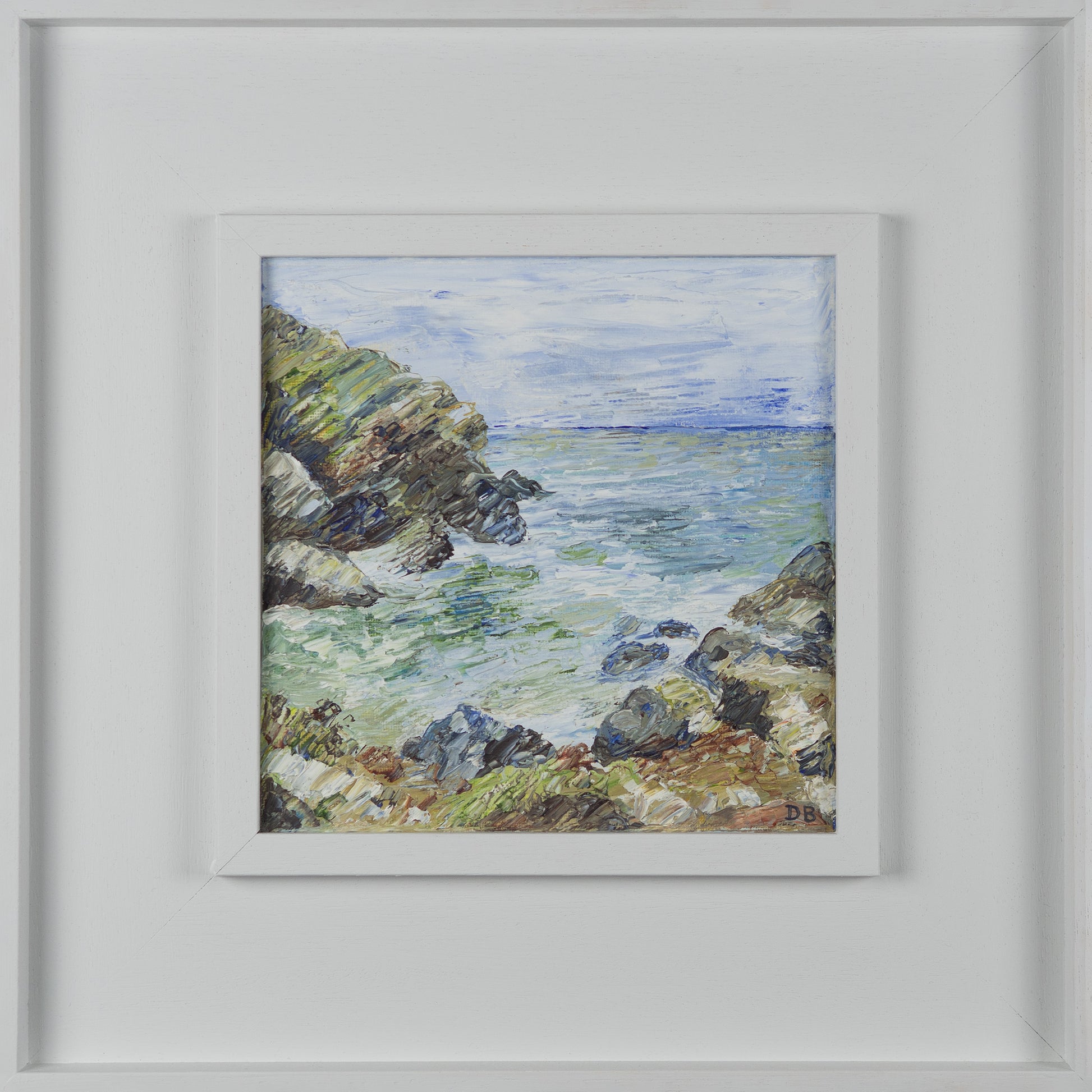 Landscape painting of Cadgwith, Cornwall, oil on canvas. Painted white St Ives frame. Frame size 36cm x 36cm