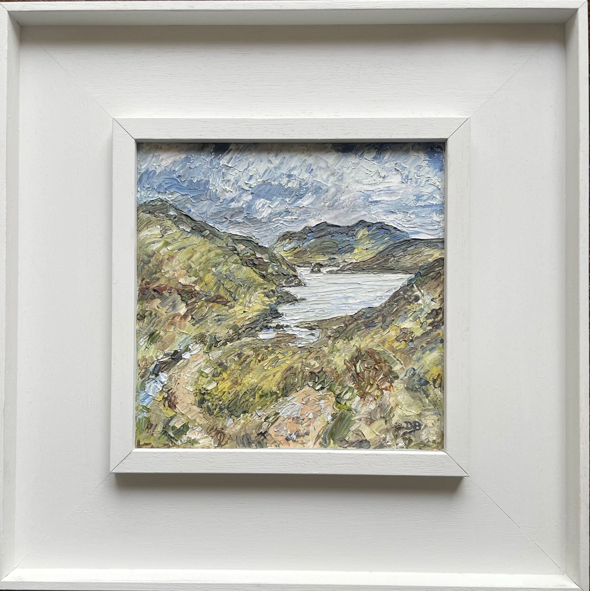 Landscape painting of Loch Kernsary, near Poolewe in Scotland, oil on canvas, using a palette knife. Painted white St Ives frame. Frame size 36cm x 36cm