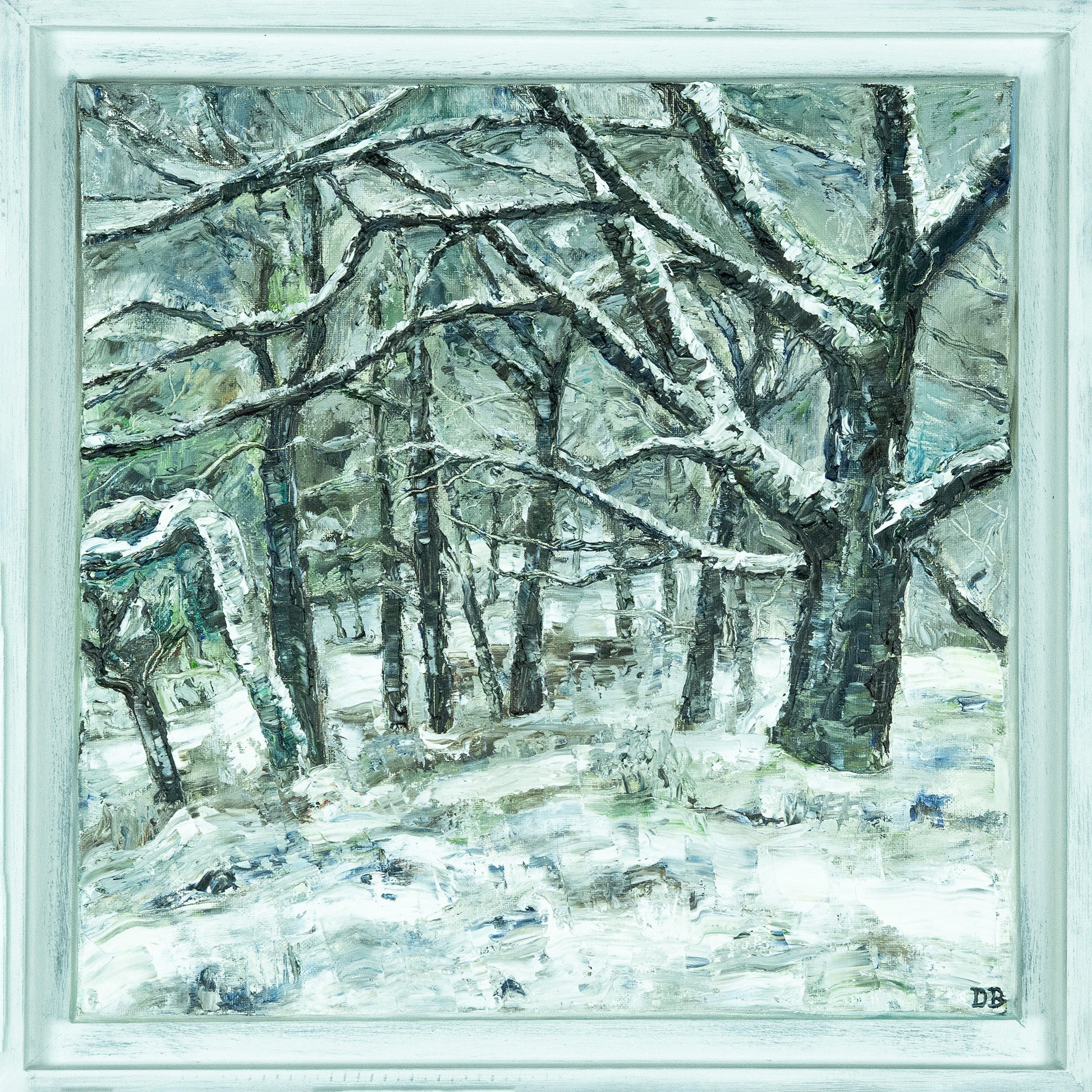 Landscape painting of snowy trees at Shooters Clough, Peak District, oil on canvas. Painted wooden distressed floater frame. Frame size 46cm x 46cm